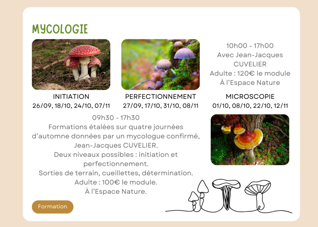 Ces formations sont dispensées par un mycologue confirmé qui saura vous transmettre sa passion et toutes les connaissances nécessaires pour bien débuter ou se perfectionner dans la reconnaissance des champignons.